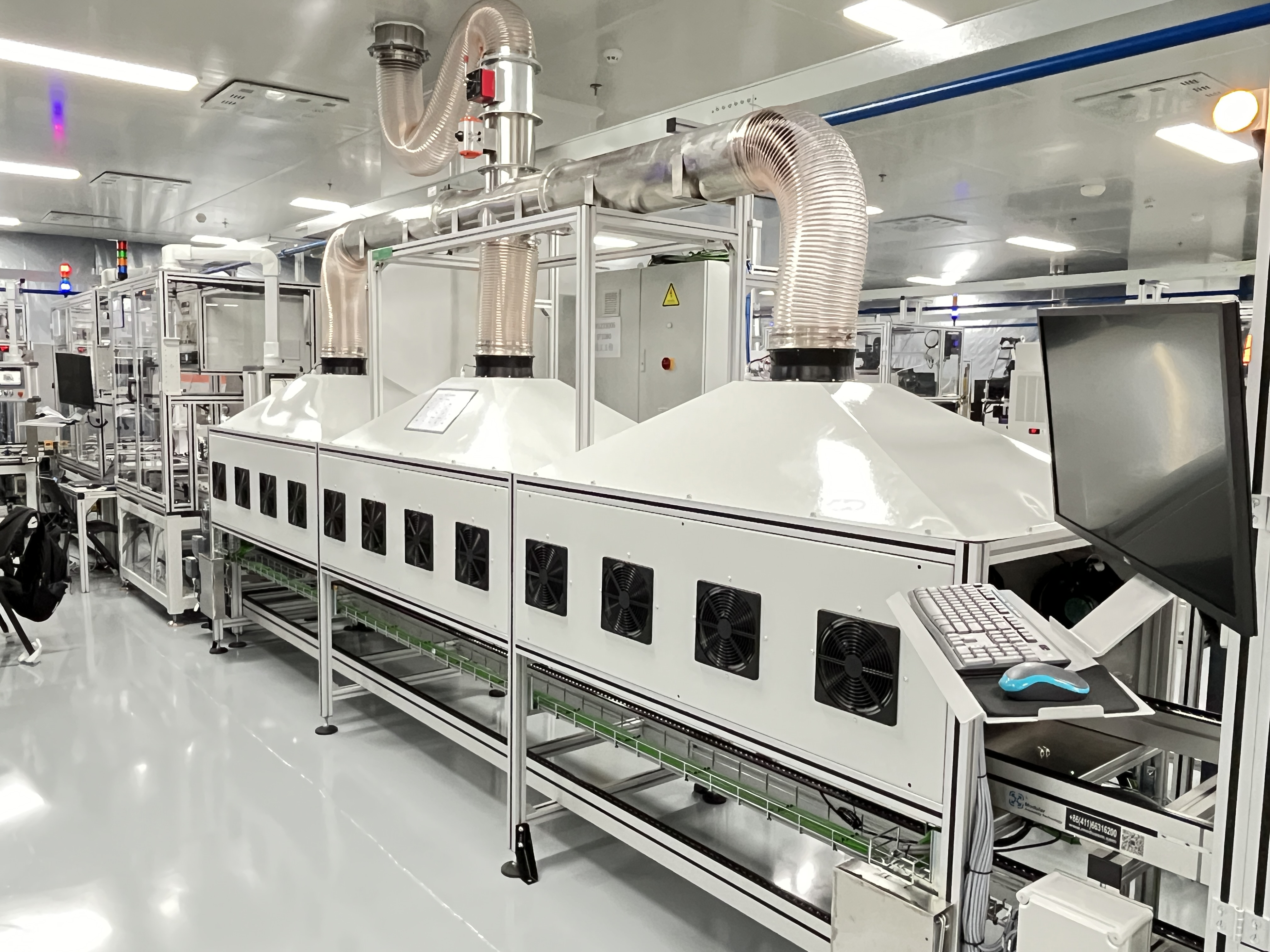 产线占地长28米、宽20米,班组人数8人 当前节拍316 s,年产能6万台;节拍可提升至75 s,年产能可达26万台